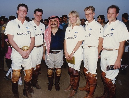 Suomen joukkueessa pelasivat (vasemmalta) Ismo Lätti, Mika Lindroos, Minna Laakkonen, Mikko Jalassola ja Petri Parkkinen. Keskellä kruununprinssi Hassan Bin-Talal.
